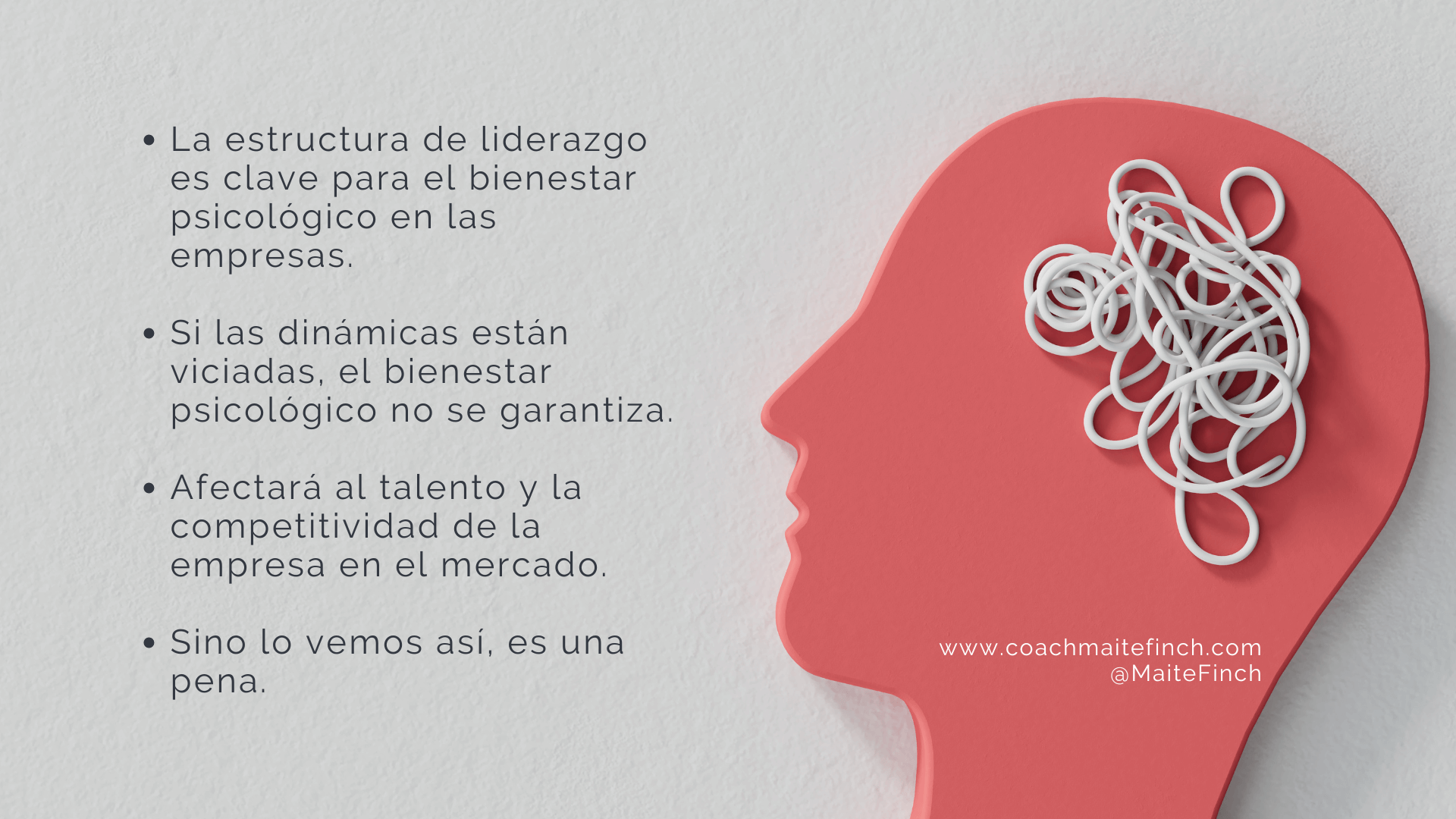 - La estructura de liderazgo y sus dinámicas relacionales son las que mejor pueden garantizar el bienestar psicológico en las empresas. Si esto está viciado, será imposible que las personas sientan que su bienestar psicológico en la empresa esté garantizado. Y como consecuencia, el talento y la competitividad de la empresa en el mercado. Sino lo vemos así, es una pena.
