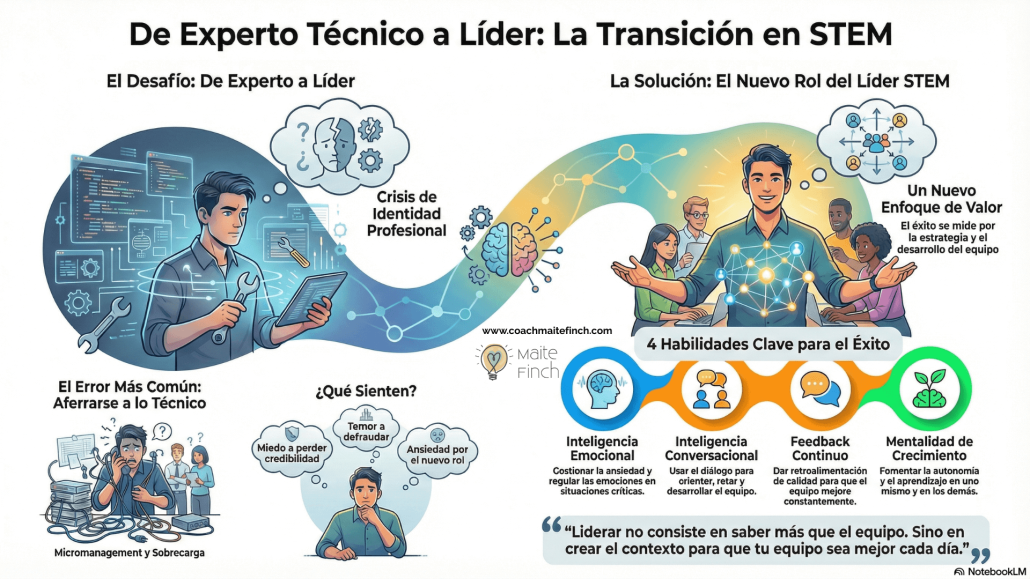 Desde mi experiencia profesional, y hace mucho tiempo, encuentro un patrón que se repite. Muchas empresas tecnológicas, ingenierías o departamentos IT apuestan por promocionar a los profesionales altamente cualificados a nivel técnico que ya llevan unos años en el puesto. Promocionan a puestos de liderazgo y, lejos de sentirse seguros, empiezan a experimentar inseguridad, dudas y miedo a no estar a la altura.